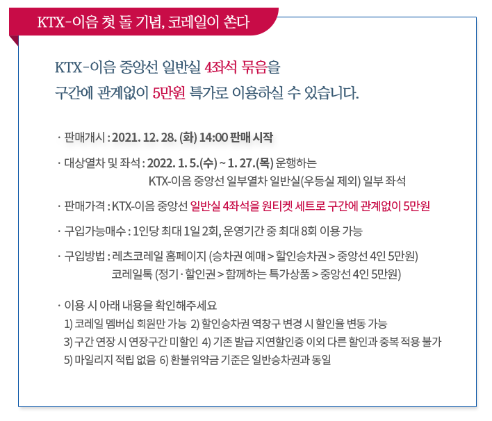 KTX 이음 중앙선 일부 열차 일반석 4자리를 묶음으로 5만 원에 판매하는 이벤트를 시행합니다.