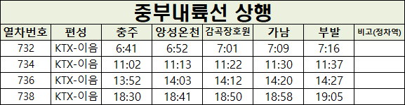 중부내륙선은 1일 4회 운행되며 시간표는 다음과 같습니다.