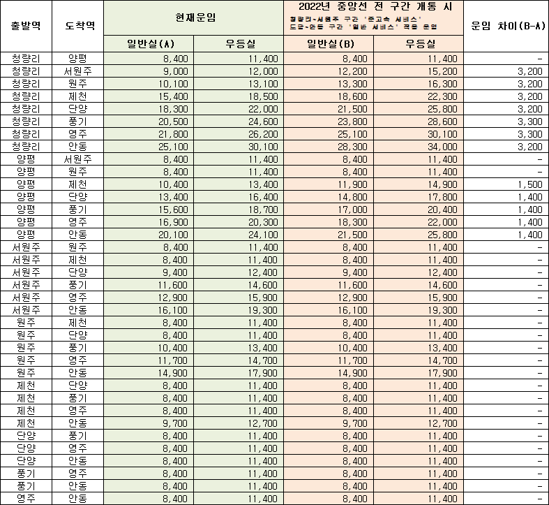 KTX이음의 중앙선 구간 요금표는 다음과 같습니다.