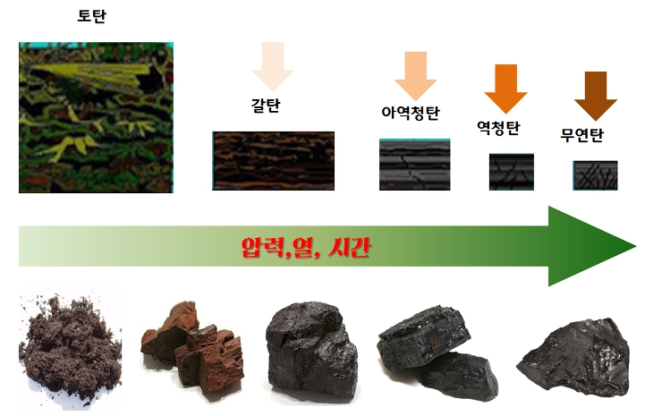 가) 니탄(泥炭 : Peat) : 갈색 또는 황색이며 진흙상이다. 탄소 53~59%, 발열량은 3,000~4,000 Kcal로 연료가가 적다. 소태류가 늪속에서 퇴적하여 탄화한 것으로 한랭한 지방에 많이 분포되어 있다.