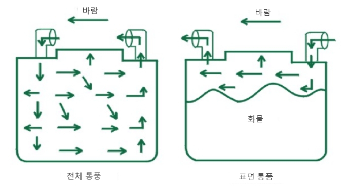 아. 석탄으로부터 방출된 메탄가스가 선창내에 축적되지 않도록 표면통풍을 시행한다. 단, 탄층내에 공기가 유입되므로서 자연발화가 촉진되지 않도록 충분한 주의를 기울인다.