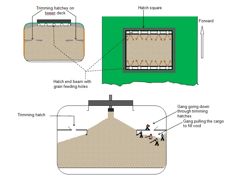 타. Grain loading 시 계획한 Trim을 구할 시 기본 Data 차이 관계로 계산과 실제는 차이가 날 수 있으므로 Last 2 Hold 적재는 Trimming moment가 큰 맨 앞쪽 Hold 또는 맨 뒤쪽 Hold와 중앙 부분 Slack hold를 택하는 것이 좋다.