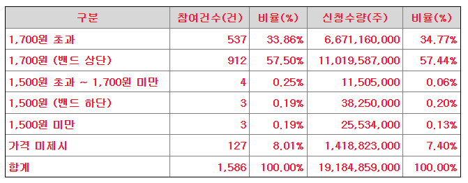 57.44%가 밴드 상단인 1,700원에 희망 가격을 제출하였으며, 33.86%가 1,700원을 초과하는 금액을 제출하였습니다.