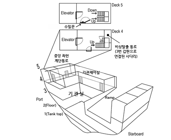 선박이 기울던 당시 기관사 1명과 실습 기관사 1명은 기관실 내부를 순찰하고 있었고 다른 두 명의 기관사는 4번 갑판에 있는 기관제어실에 있었다. 선박이 전도된 후 기관제어실(Engine Control Room)에 있던 기관사 2명은 기관제어실과 기관실의 주계단통로인 중앙 좌현 계단통로를 통해 빠져 나가려고 시도하였으나 5번 갑판의 개방된 수밀문을 통해 해수가 계단통로로 유입되어 탈출이 불가능하였다. 기관제어실에는 기관실로 바로 진입할 수 있는 선미 방향의 문이 3개 더 있었다(그림 6 참고).