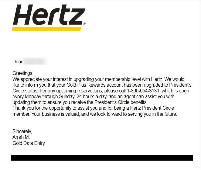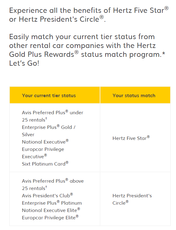 *Status match is up to Hertz President’s Circle tier and is only valid for those who have never participated in the status match prior, or if more than five years have passed since a prior status match. Applies to select competitors’ loyalty status. Ma